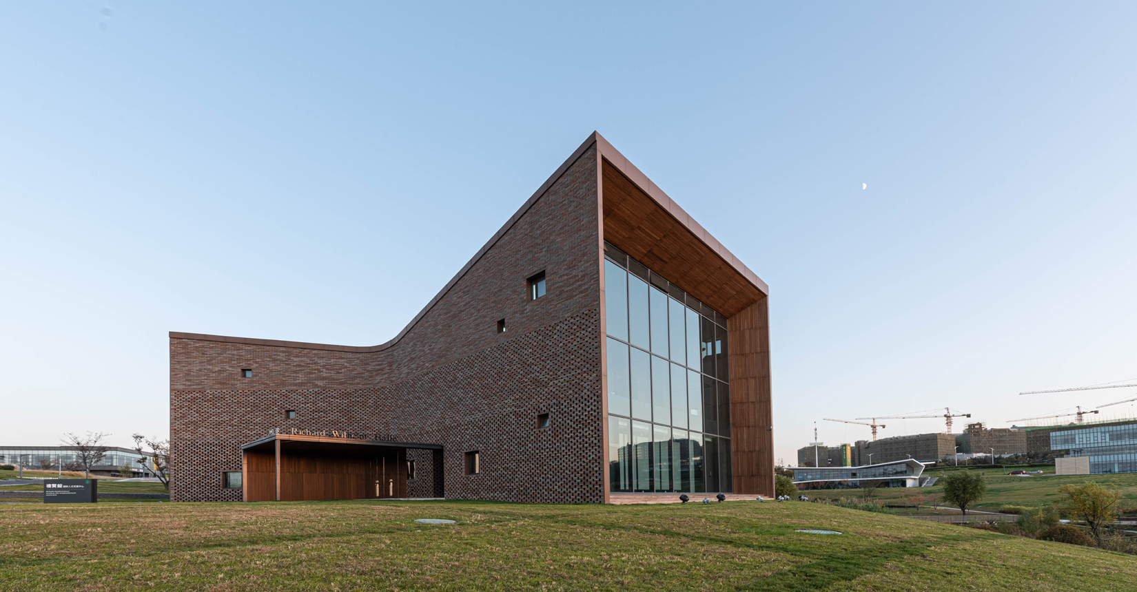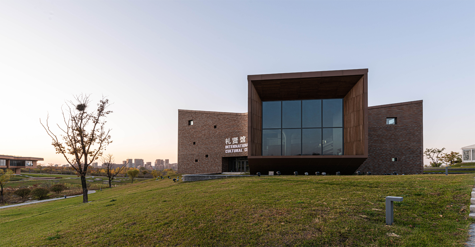 建筑南側設置次要出入口,并與水流形成互動。建筑立面材質采用精致的磚材拼面,屋頂采用微微揚起的處理手法;穩重且不失變化。