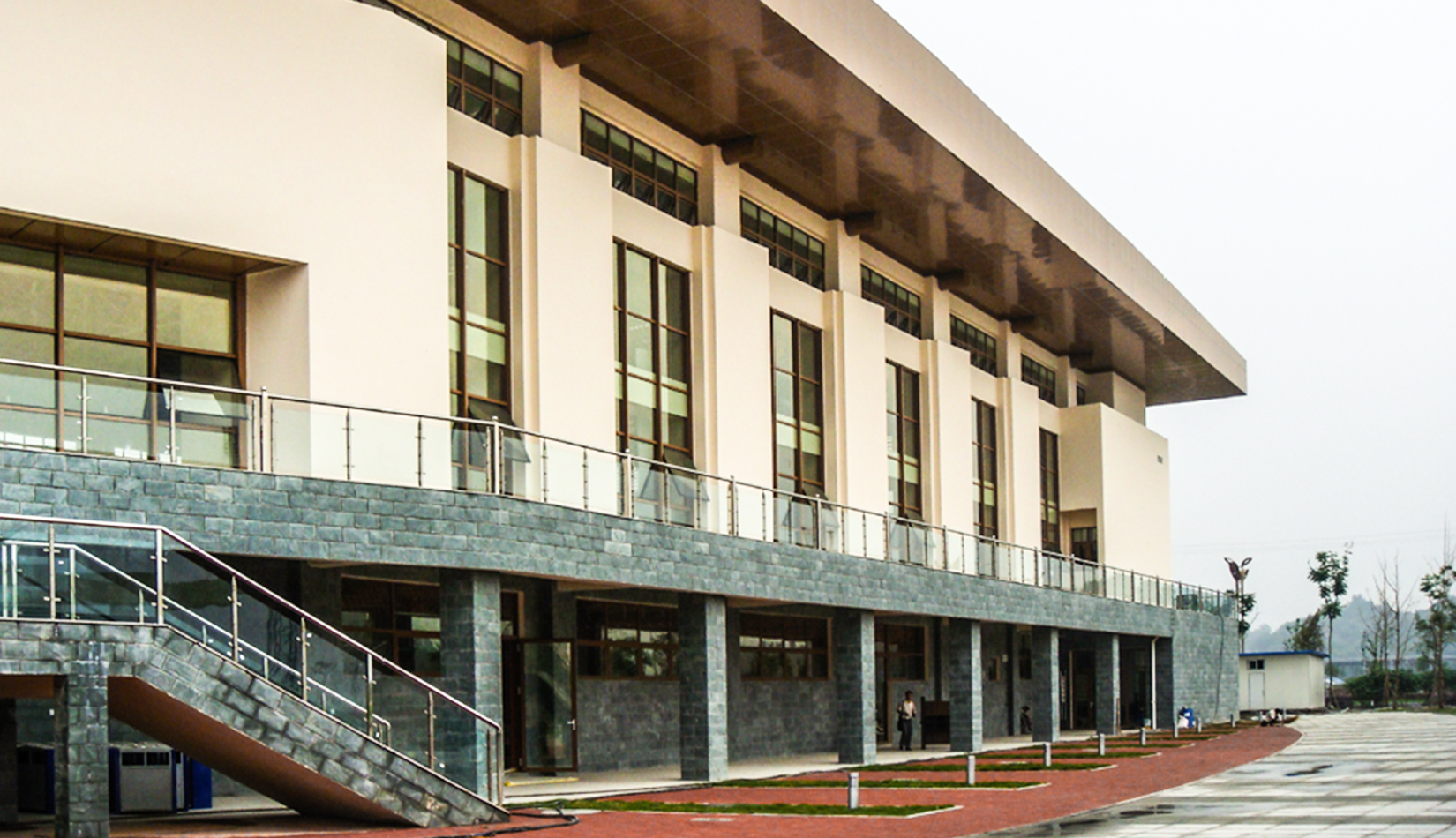 北川羌族自治縣體育中心位于新縣城南端的95 號街坊內,用地面積5.6 公頃,現狀地形平坦。北側為濱河路,毗鄰永昌河公園景觀帶,西側為禹龍路,隔路與安昌河相望,東側為貫穿新縣城的交通干道- 齊魯大道,用地四周環路,交通便利,地處北川新縣城的南門戶,是進入縣城的標志性建筑。