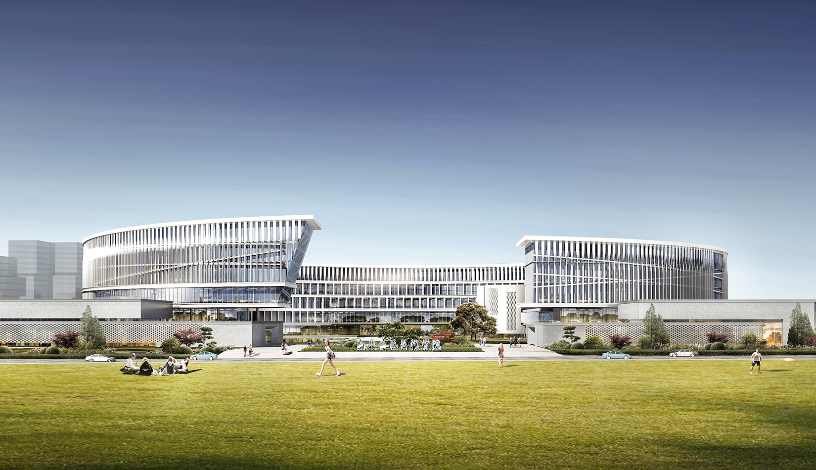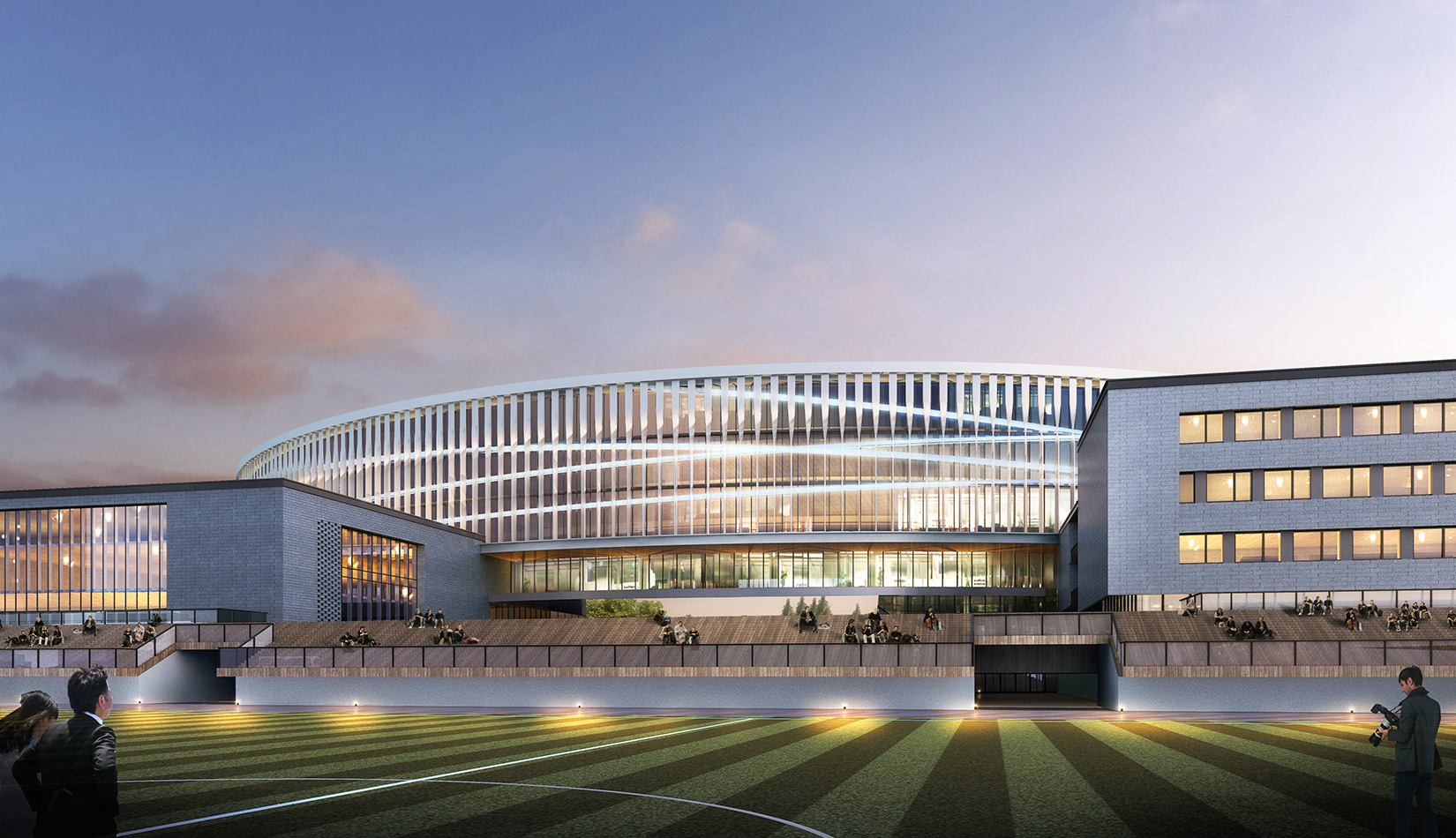 建筑方形體量運用魯班鎖的本質——榫卯結構,進行體塊塑造,將這種天人合一的工匠精神貫穿整個校園。立面材質上,采用石材及具有中國古典韻味的磚幕墻,體現學校厚重的文化底蘊。“魯班線”交織在教學綜合體所在的圓形體塊上,利用動感流線型的線條,使建筑更具有藝術氣息。