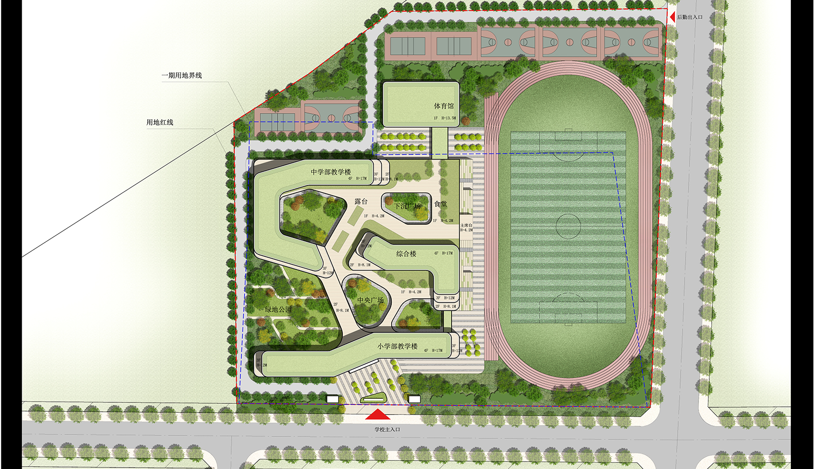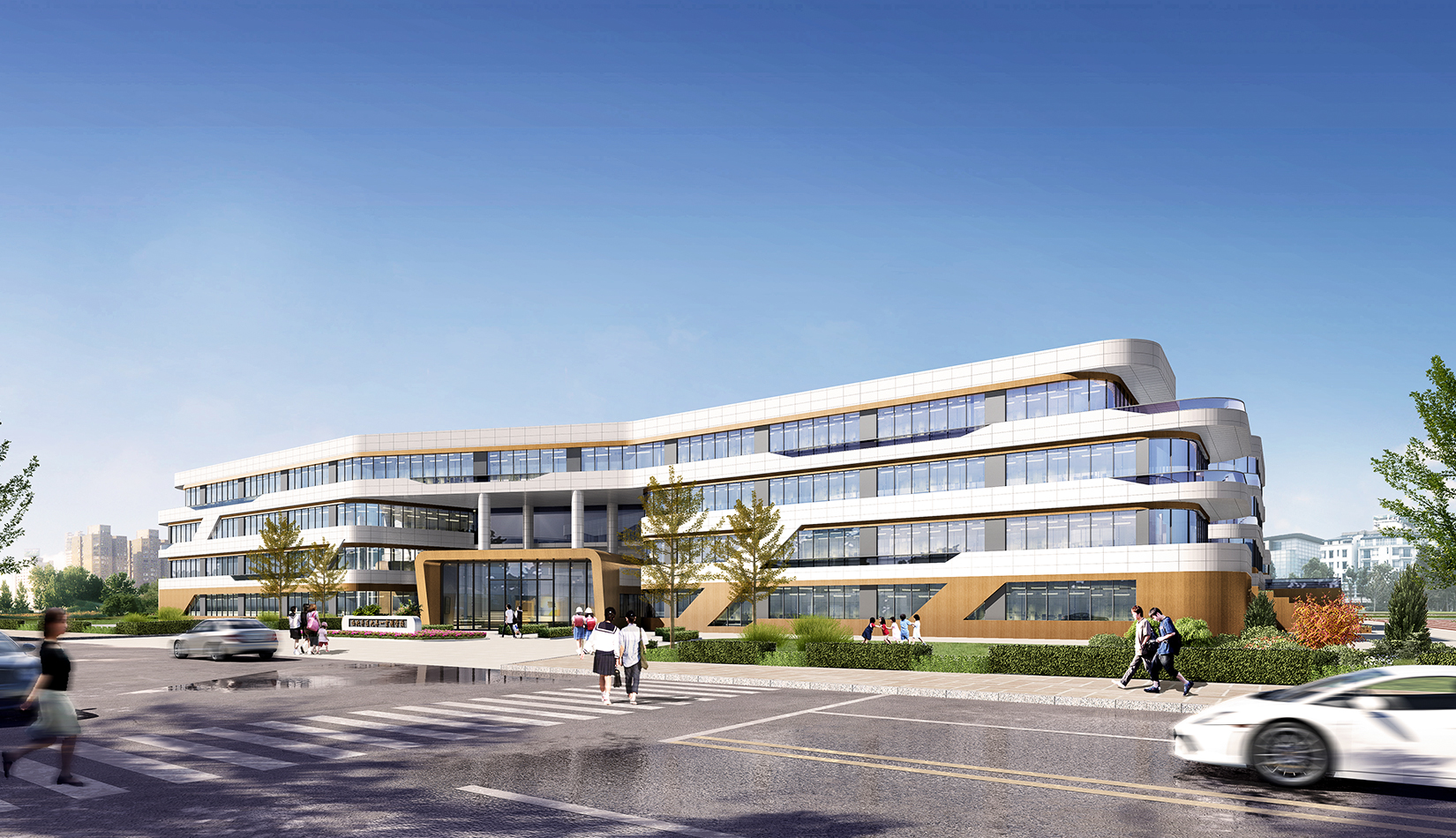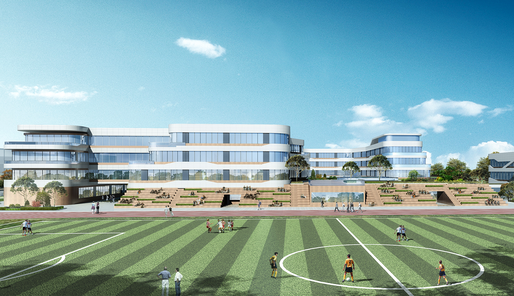 充滿綠化的連續平臺接通各教學樓,在東西南北方向形成內院,由西向東側延伸,與操場融為一體,提供了良好的視覺穿透性。建筑風格現代富有動感,線條流暢,形成強烈的可識別性。