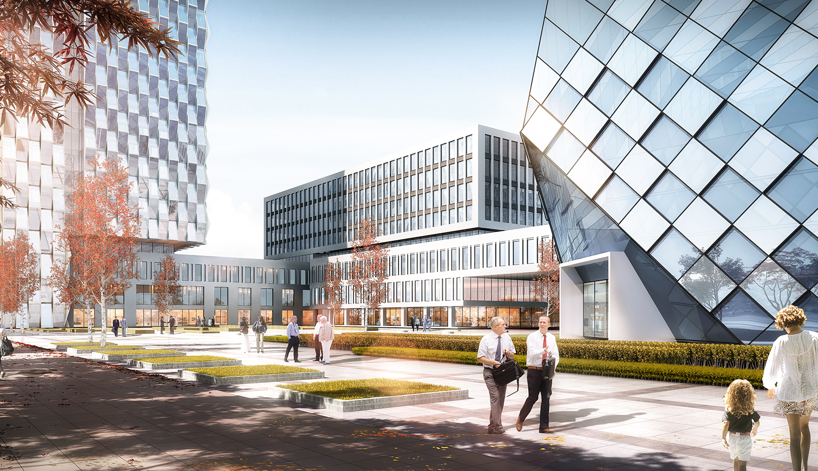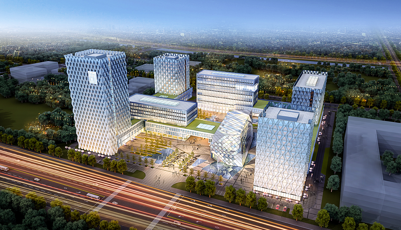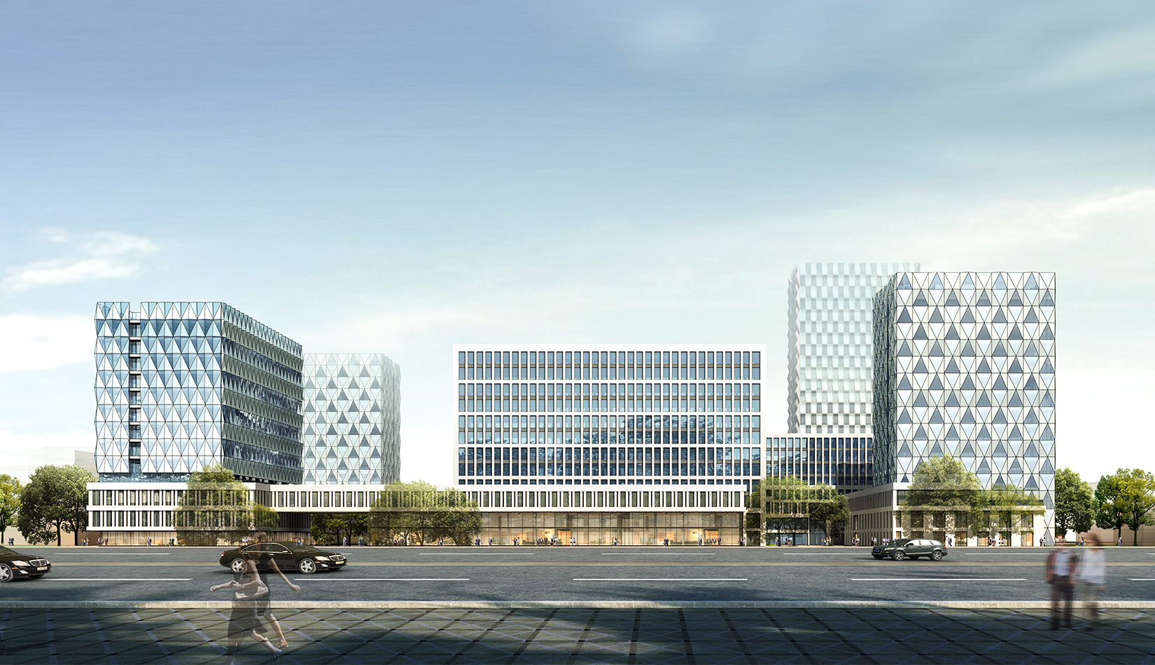 建筑立面風格現代簡潔,高層塔樓以玻璃與金屬幕墻為主,塑造其硬朗簡潔的建筑性格,內部兩棟建筑采用格構式立面風格,同樣以簡潔為設計原則,展現其富有理性秩序的立面形象。