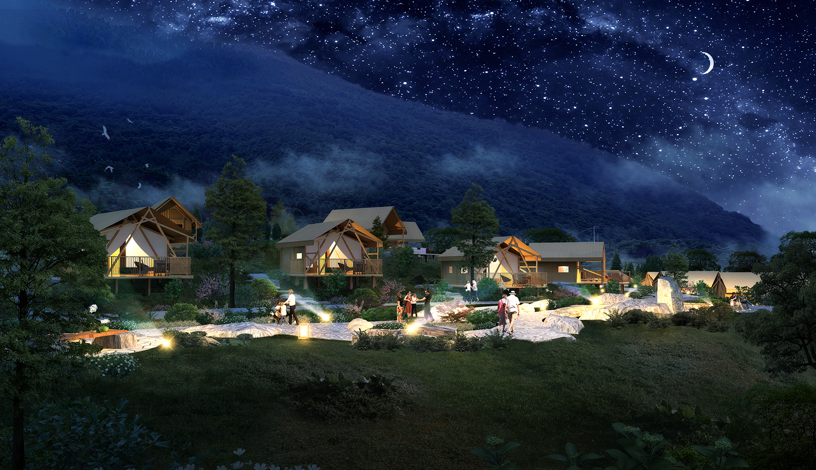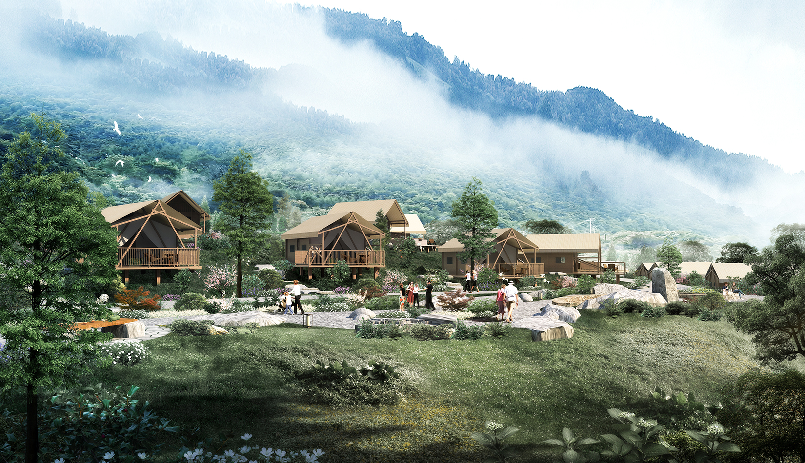 根據基地的地勢分布及功能需求,空間結構上分為“一帶兩軸三核心五組團”。建筑設計的五個組團,分別是濱水休閑組團、水畔風光帳篷組團、高端養心帳篷組團、中心服務組團及山居野趣帳篷組團。客房部分采用帳篷度假屋的方式,凸顯野奢度假的浪漫形式。