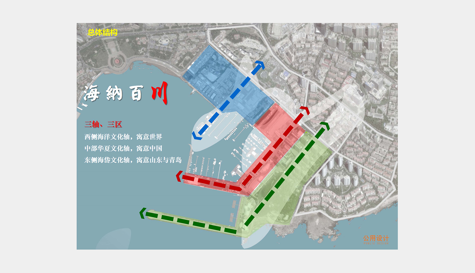 總體規劃以“青島與世界對話,合作與發展共贏”為核心理念,“海納百川、帆揚世界”為主題定位,形成了三軸、三區的“川”字型整體規劃結構。
