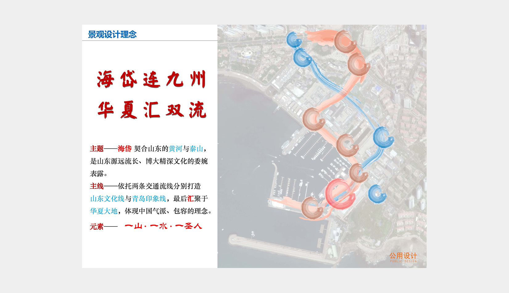 在此基礎上,確定迎賓動線方案,完善整個區域動態及靜態交通規劃,結合奧帆中心原有的景觀資源和山東、青島文化元素,以“海岱連九州,華夏匯雙流”為景觀設計理念,布局重要景觀標志節點。
