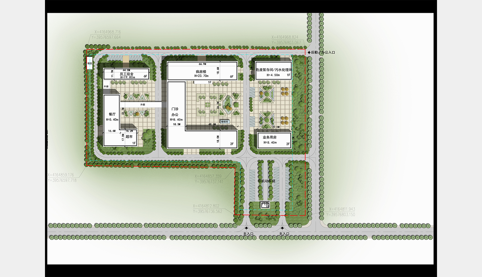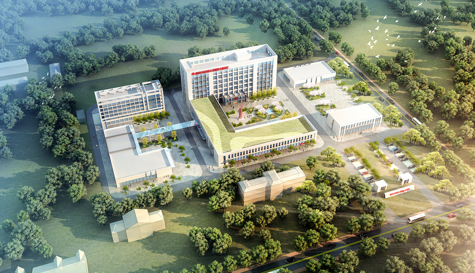 景觀設計采用圍合、穿插、滲透等設計手法,營造公園式景觀綠化,與建筑群體融合呼應,打造一個會呼吸多元化的綠色醫院,利用建筑之間的圍合關系,創造動態的具有生命力的局部景觀。