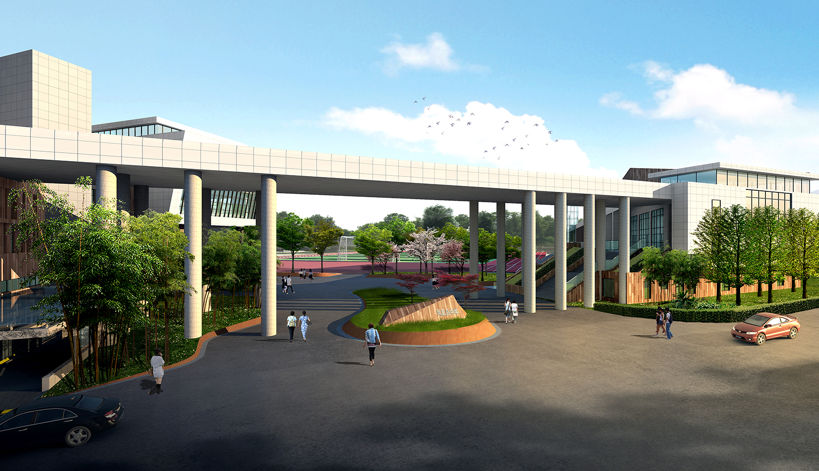 1. 將抽象化的鳳翎設(shè)計(jì)成特色種植,結(jié)合建筑形態(tài)配以流線型鋪裝設(shè)計(jì),在鋪裝上增加鳳凰島中學(xué)校訓(xùn)校風(fēng)的細(xì)節(jié)設(shè)計(jì),凸顯學(xué)校濃郁的文化氛圍以及室外景觀環(huán)境的精致。