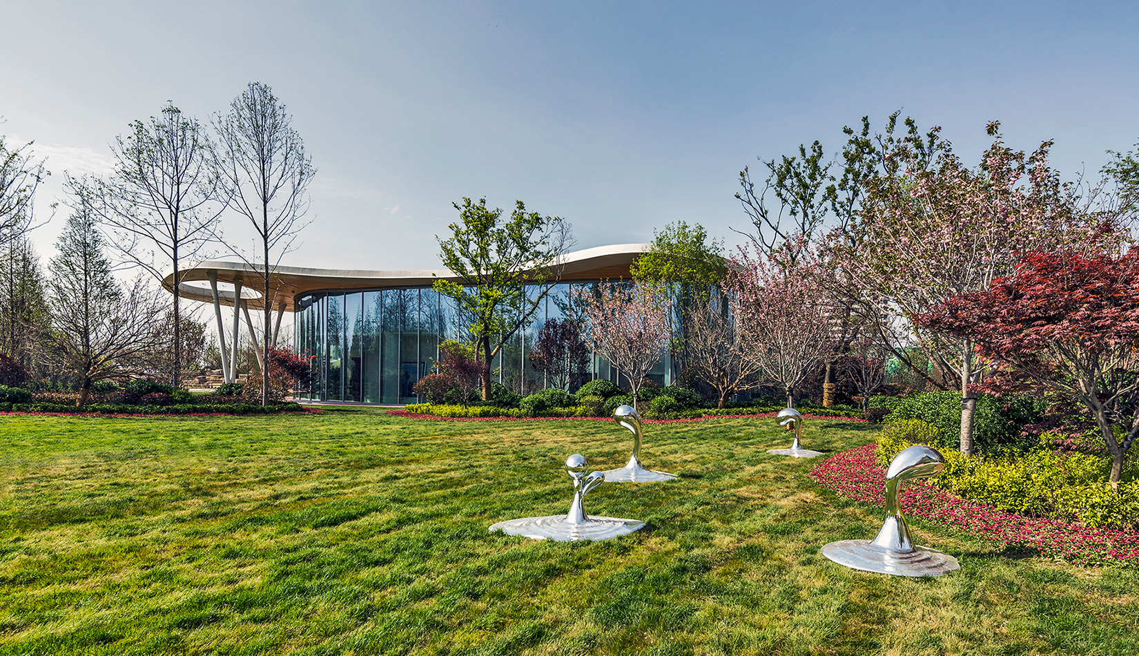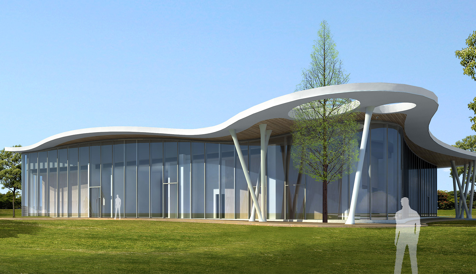 該項目以“森林中的小屋”為理念,通過“自由流水形態(tài)的木質(zhì)屋頂加純凈的玻璃幕墻”的組合,從而達到建筑與自然的共生,使得建筑真正的融合于自然風(fēng)景之中。設(shè)計師將節(jié)能、