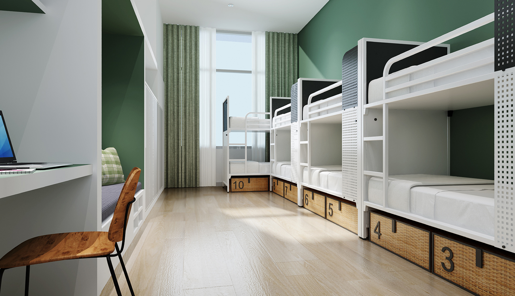客房采用木色為空間主色調,巧妙利用上下床與衣柜的組合排列方式構建出一個簡潔精致的精品化公寓。