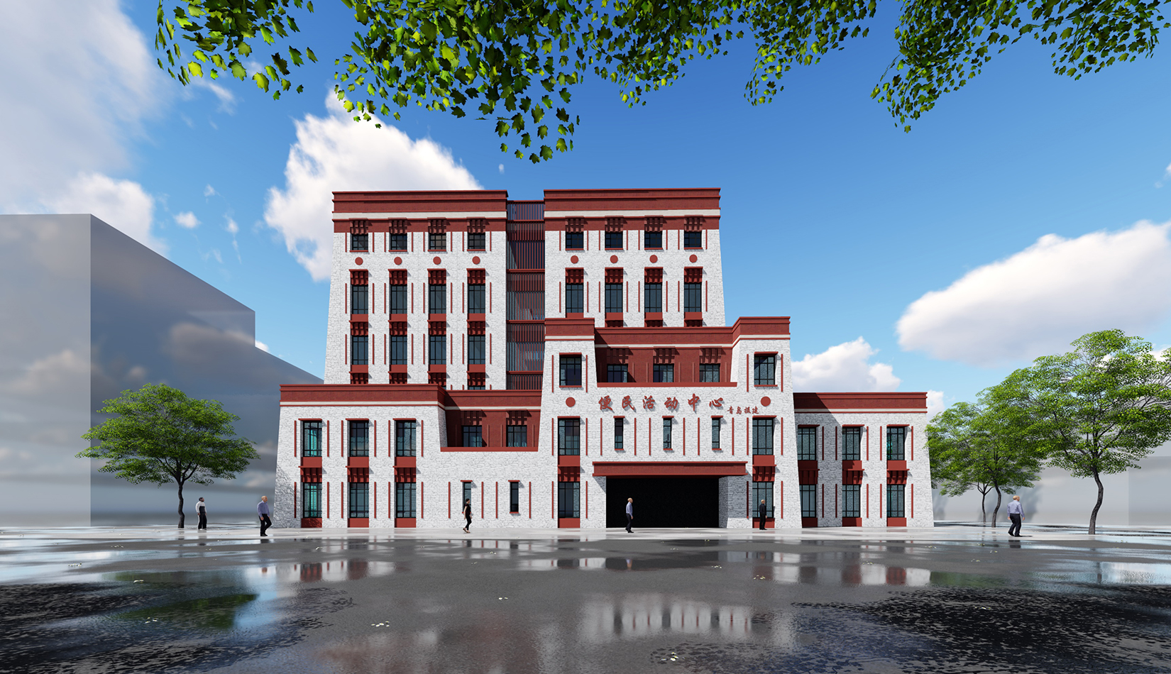 立面采用傳統藏式建筑風格,外墻以白色為主,門廊檐下紅、黃、綠、藍原色艷麗彩畫。藏建筑門邊、窗邊飾有黑色上小下大的邊框,寓意為“牛角”,傳說能給人帶來吉祥。簡練、概括的藝術形象,裝飾性極強。