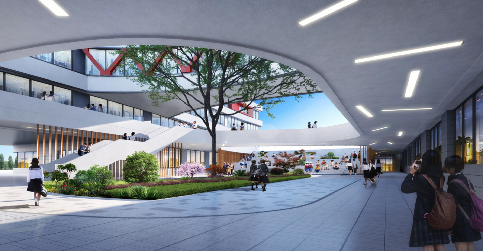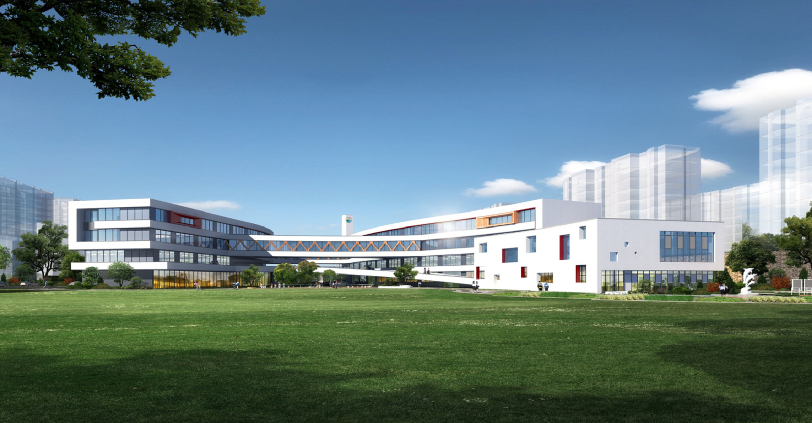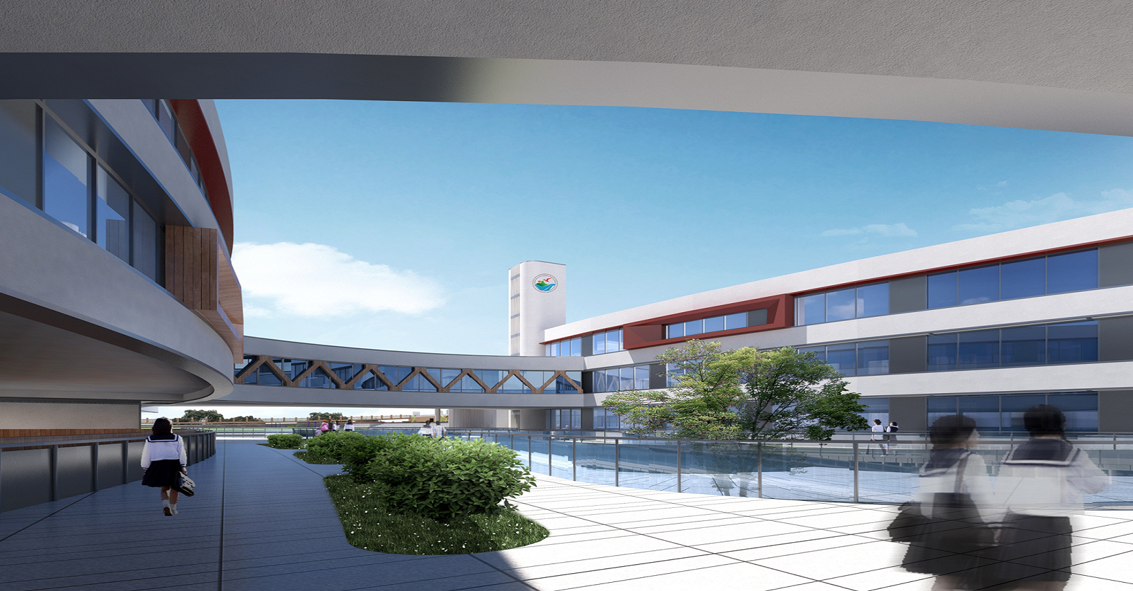 校園規(guī)劃采用曲線手法,營造流水姿態(tài),將東側(cè)山脈與西側(cè)河流連接在一起。設計現(xiàn)代化“山水”校園,使學生在自然中成長。營造活水發(fā)源的“源頭”意境,寓意教育為人類文化長河的源頭,呼應學校“源頭”文化。曲線舒展的形體,整體采用白色色調(diào),局部以紅黃色進行點綴,風格純潔又不失活潑。